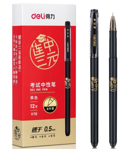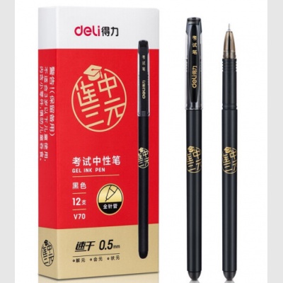 得力 连中三元考试速干中性笔 0.5mm拔帽全针管 12支/盒 V70