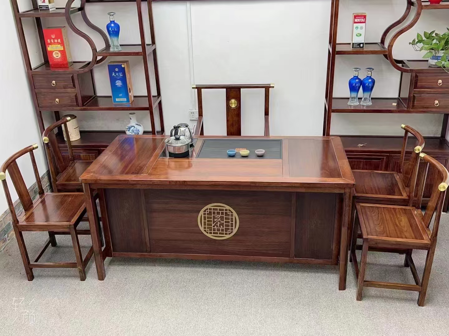 茶座茶台(180cm*80cm、胡桃色、实木)1主椅+4辅椅+1置物架