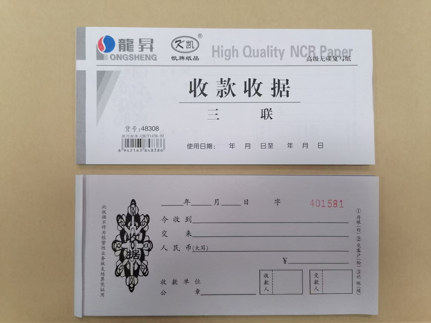 龙升无碳复写收款收据/现金收据48308(三联、48K、整包20本起售)