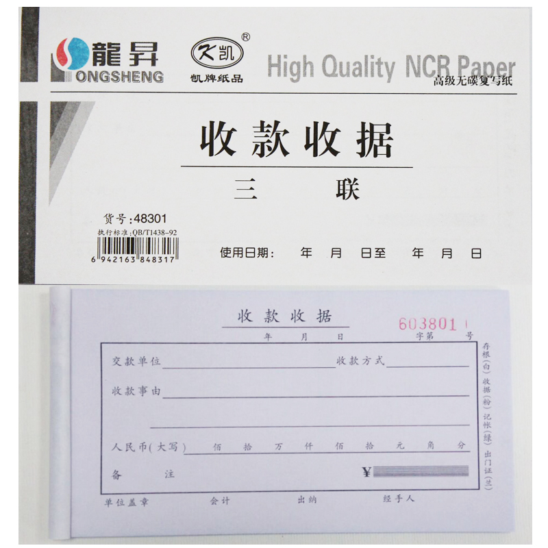 龙升 无碳复写收款/现金收据48301(三联、48K、整包20本起售)/庆丰