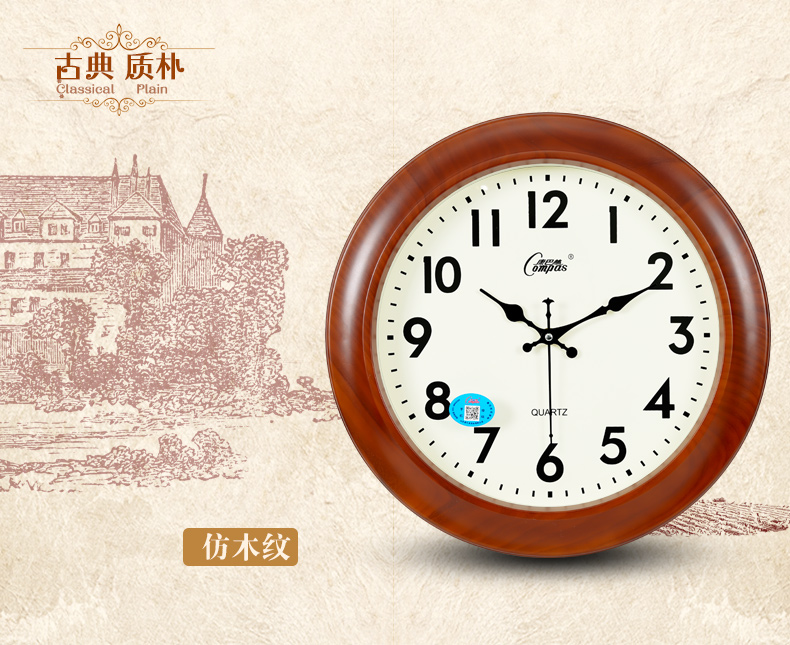 康巴丝(Compas) 欧式钟表客厅创意办公静音挂钟石英钟 仿木
