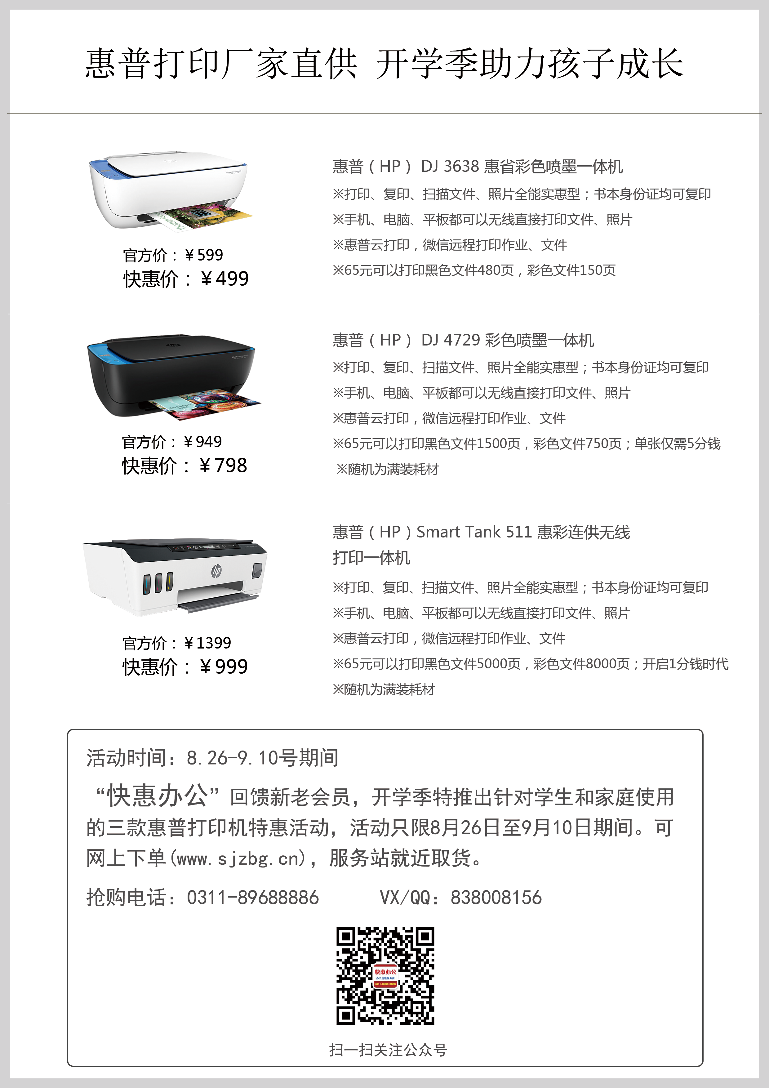 炎热的夏天已渐行渐远,凉爽的秋季已经来临。又要开学了,快惠办公联合惠普打印共同推出了针对学生的特惠机型。价格虽然优惠多多,机型却是新上市的功能性新品,微信无线打,不在家中也能打作业、试题,为学
